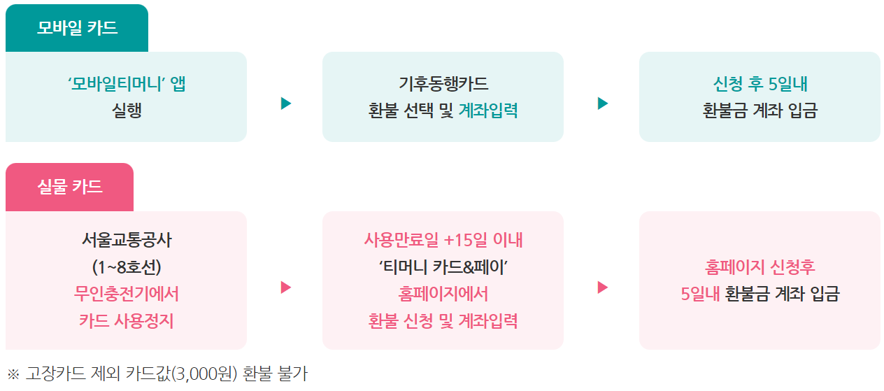 사용만료일 전 사용잔액의 환불을 원하는 경우는 충전가격에서 이용요금과 수수료 오백 원을 제외하고 환불처리가 가능합니다. 티머니 앱이나 티머니 카드&페이에서 환불신청을 하면 5일 내 신청하신 계좌로 입금됩니다. 현재는 계좌환급만 가능하니 참고 바랍니다.