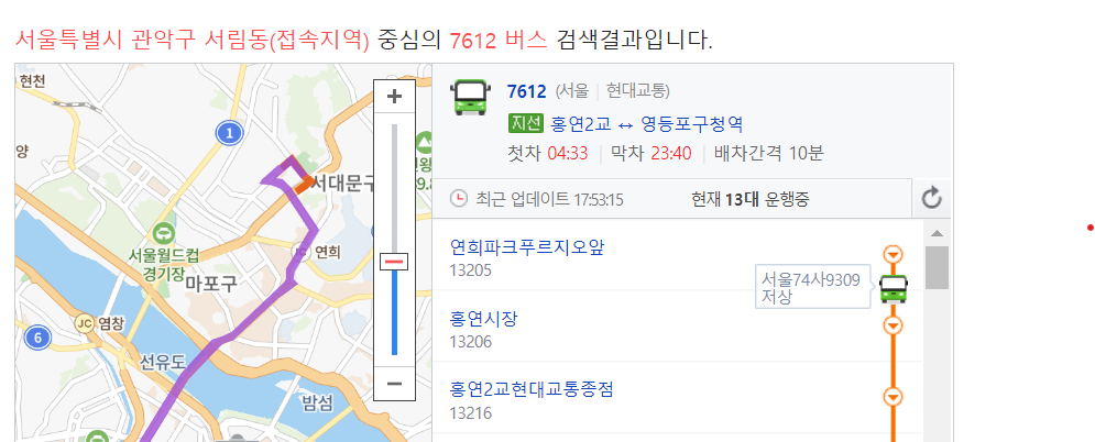 확인하는 방법이 두 가지가 있습니다. 네이버등 포털 사이트에서 버스번호를 검색하거나 서울시 교통정보센터에서 확인이 가능하다고 하는데요. 제가 두 군데 다 검색해 보니 포털사이트에서 확인하는 게 훨씬 더 간편했습니다. 네이버에서 버스 번호를 검색하면 저렇게 버스 정보가 나오는데 버스 번호 옆에 서울이라고 쓰여있는지 확인하시면 됩니다.