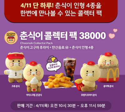 맥도날드 한정판 메뉴인 춘식이 콜렉터팩은 고구마 후라이에 탄산음료, 그리고 춘식이 인형을 함께 받을 수 있는 패키지 팩입니다. 약간 어른용 해피밀 같은 느낌도 드네요.
