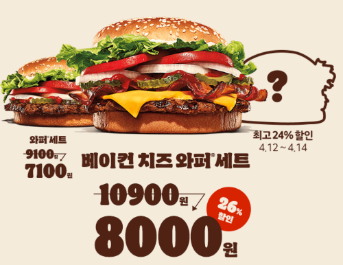 | 10일 | 와퍼세트 22%할인 베이컨 치즈와퍼 세트 26% 할인 |