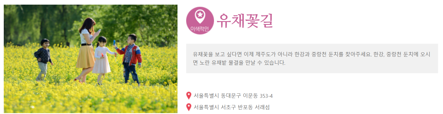 제주도에서나 흔히 볼 수 있는 꽃이라고 생각했는데 서울에서도 유채꽃을 볼 수 있는 곳이 있습니다. 이젠 유채꽃이 보고 싶으시다면 한강과 중랑천 둔치를 찾으시면 되는데요.