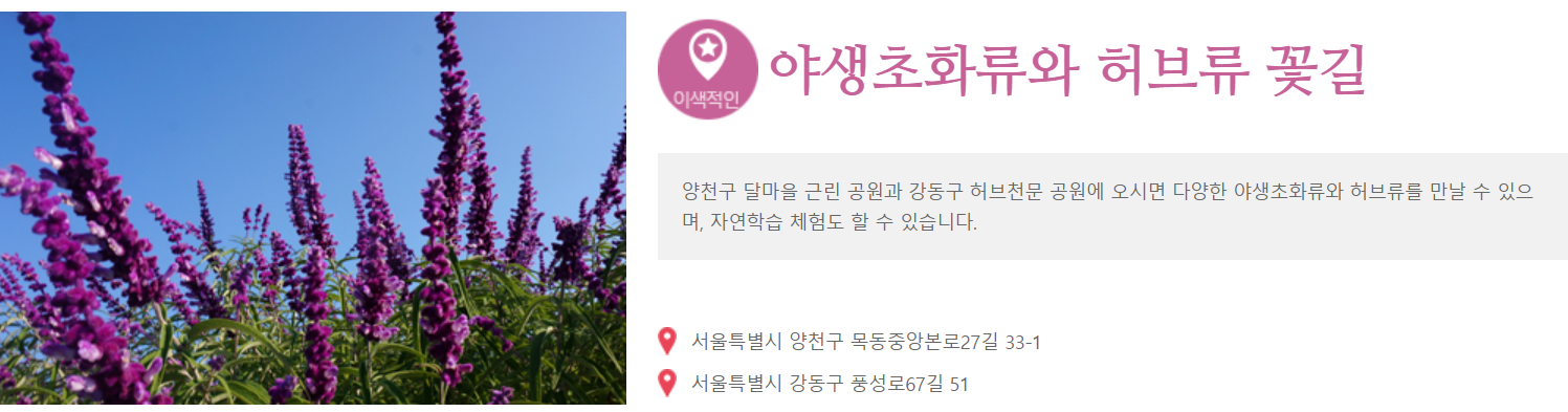 양천구에 있는 달마을 근린공원과 강동구 허브 천문공원에서 다양한 양생초화류와 허브류를 만나볼 수 있는데요.