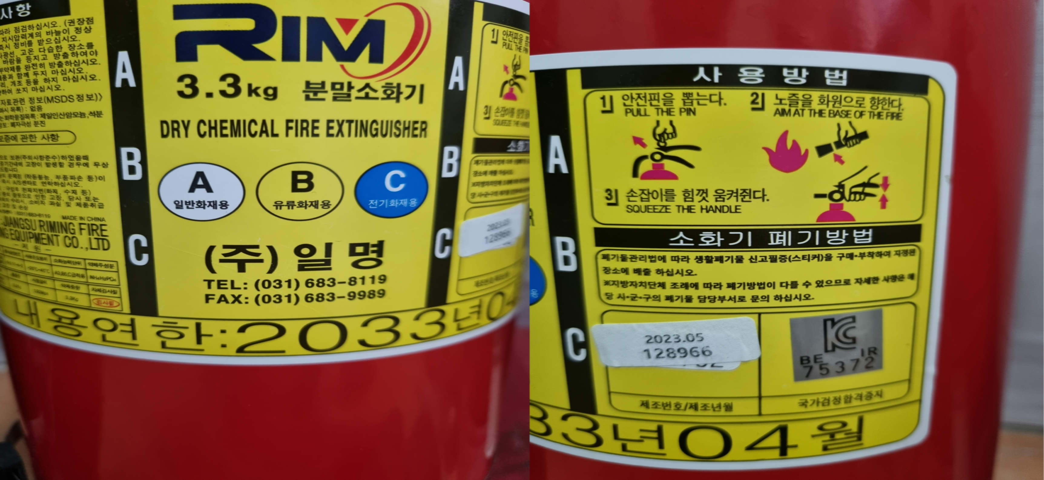 얼마 전에 소방서에서 나눠준 소화기가 있어 한번 찍어봤습니다. 전면을 보니 내용연한이라고 해서 유통기한이 기재되어 있었습니다. 보통 소화기의 유통기한은 제조일자로부터 10년 정도라고 해요. 저희 집 소화기도 2033년까지 사용가능한 걸로 되어 있네요. 기재된 내용연한을 바로 확인하거나 제조일자를 확인해 10년이 지난 상태라면 제대로 동작을 안 할 가능성이 크기 때문에 폐기하는 게 좋습니다. 소화기는 어디다 두는 지도 중요한데요. 직사광선이 내리쬐는 곳이나 고온다습한 곳을 피해서 두시는 것이 좋고 소화기의 지시 압력계 바늘이 파란색 정상 범위를 벗어난 경우 즉시 a/s 받거나 교체해야 한다고 하니 꼭 기억해 두세요.