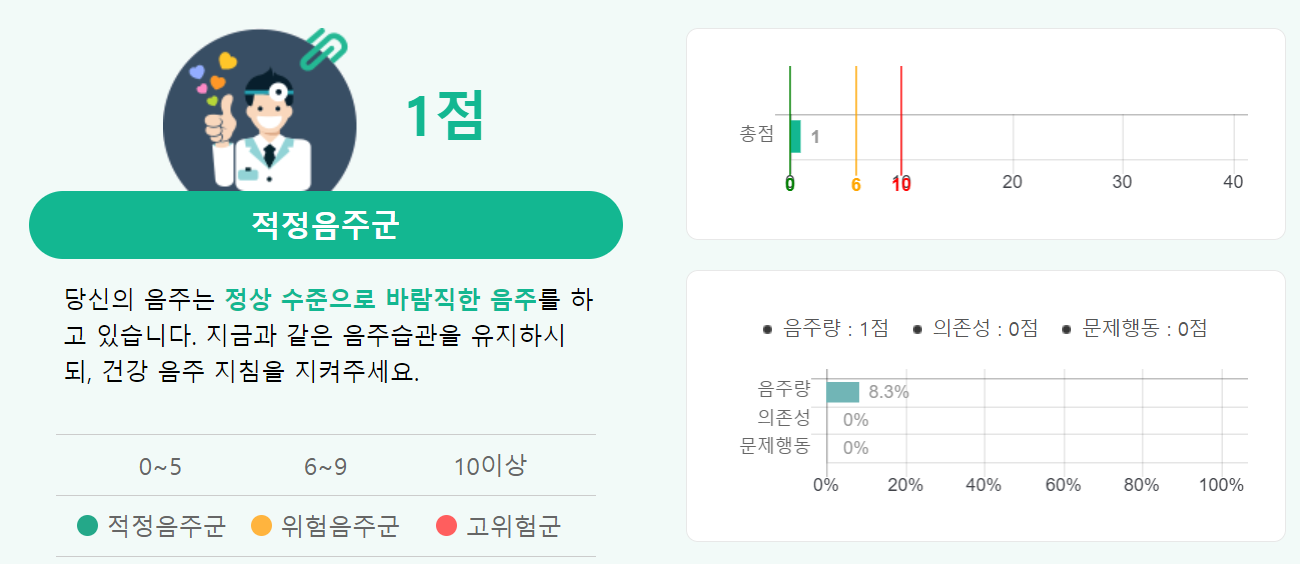 만약 음주를 하고 나서 블랙아웃 현상을 겪는다거나 음주량이나 음주 횟수 조절에 자주 실패하게 된다거나 음주를 하고 나서 피곤하고 회복이 안 되는 증상을 겪는다거나 하는 여러 가지 문제 증상들이 생기는 걸 겪어보셨다면 오디트 검사를 한번 해보세요. 문제가 반복적으로 발생될 때에는 가까운 병원이나 중독관리 통합지원센터등을 통해 도움을 받아볼 수도 있습니다. 술도 몸과 정신이 모두 건강할 때 즐길 수 있다는 걸 늘 명심하시고 조금이나마 애주가 분들에게 도움이 되셨다면 좋겠습니다. 감사합니다.
