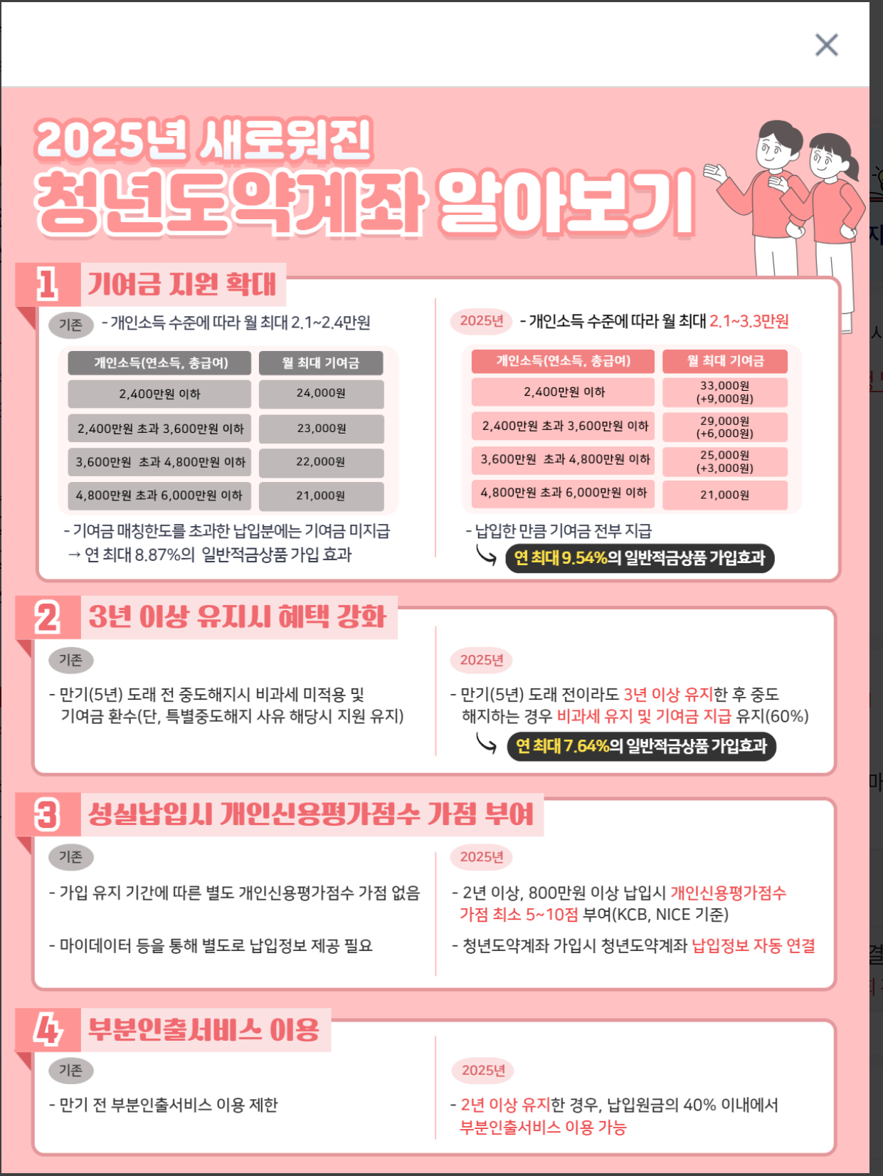 정부는 매년 청년 맞춤형 자산 형성 정책을 확대하고 있으며, 청년도약계좌는 그 중심에 있는 제도입니다. 본인의 소득 조건과 가구 기준만 충족된다면 누구나 손쉽게 가입할 수 있으며, 비과세 혜택과 우대금리, 소득공제 등의 세제 혜택도 함께 제공됩니다. 이러한 점을 고려하면 청년도약계좌는 단기 저축이 아닌 장기 재무계획의 중요한 수단으로 적극 활용해야 할 금융 상품입니다.