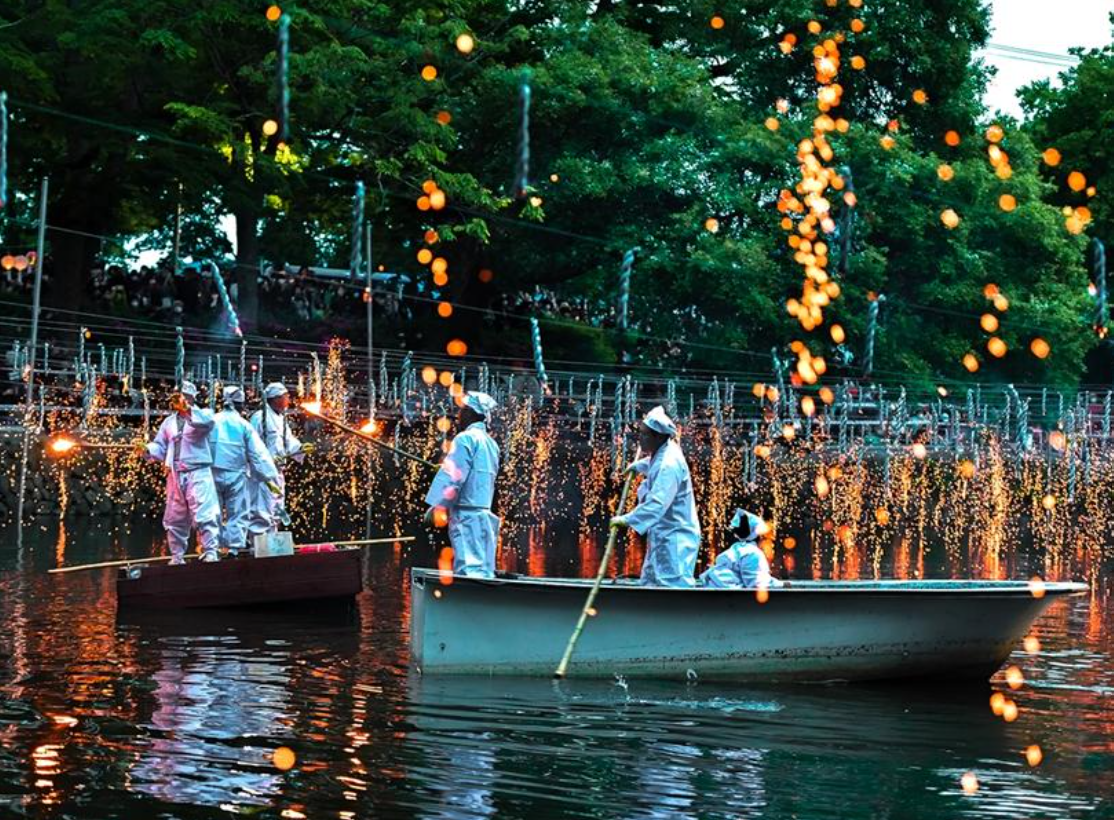 불을 붙이기 위한 낙화봉을 만들기 위해서는 나무를 베고 숯을 굽는데 이것이 완성되기까지 20일 정도가 걸린다고 합니다. 이 행사의 화룡점정은 점화식인데, 낙화놀이보존회의 회원들이 뗏목을 타고 이동해 연못에 걸린 낙화봉에 일일이 불을 놓습니다. 낙화봉에 불이 붙으면 2시간 남짓 불꽃이 타오르는데요. 이때 매단 불꽃이 연못으로 떨어진다고 해서 낙화라고 하기도 하고, 꽃이 떨어지는 것 같이 아름답다 해서 낙화라고 하기도 합니다.