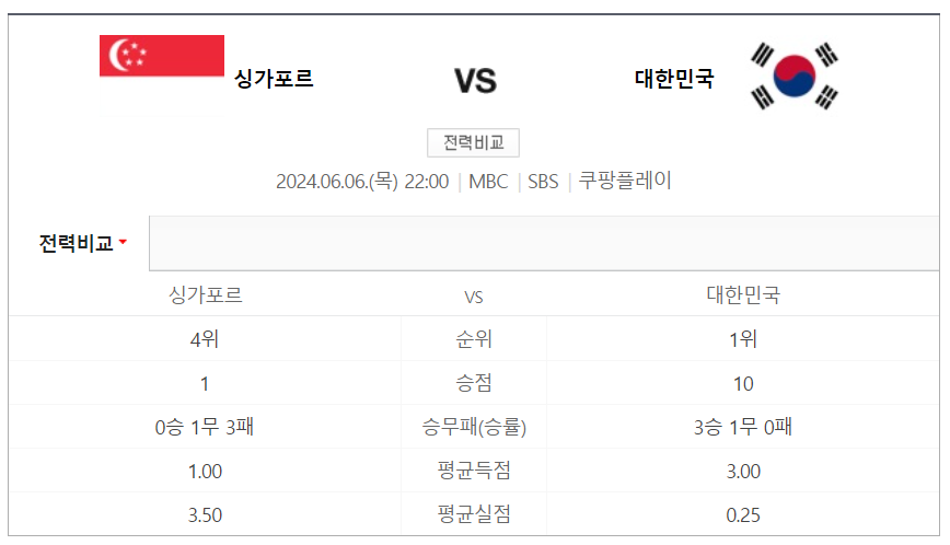 오늘은 6월 6일 열리는 싱가포르와의 5차전 경기에 대한 내용과 2차 예선 현재까지의 순위, 중계는 어디에서 볼 수 있는지 알아보았습니다.
