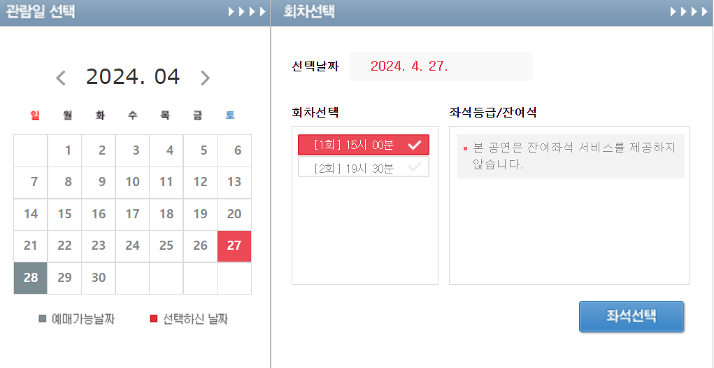 예매하기 누르고 들어가서 관림일, 회차, 좌석선택까지 쭈주죽~~ 클릭클릭 할 수 있도록 연습해 둡시다.
